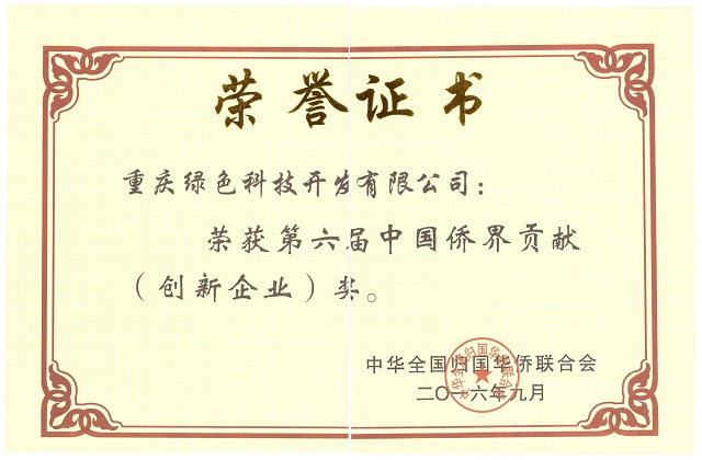 Warmly celebrate Chongqing green science and technology development limited company contribution in September 2016 won the sixth session of Chinese (Overseas Chinese Innovation Award).