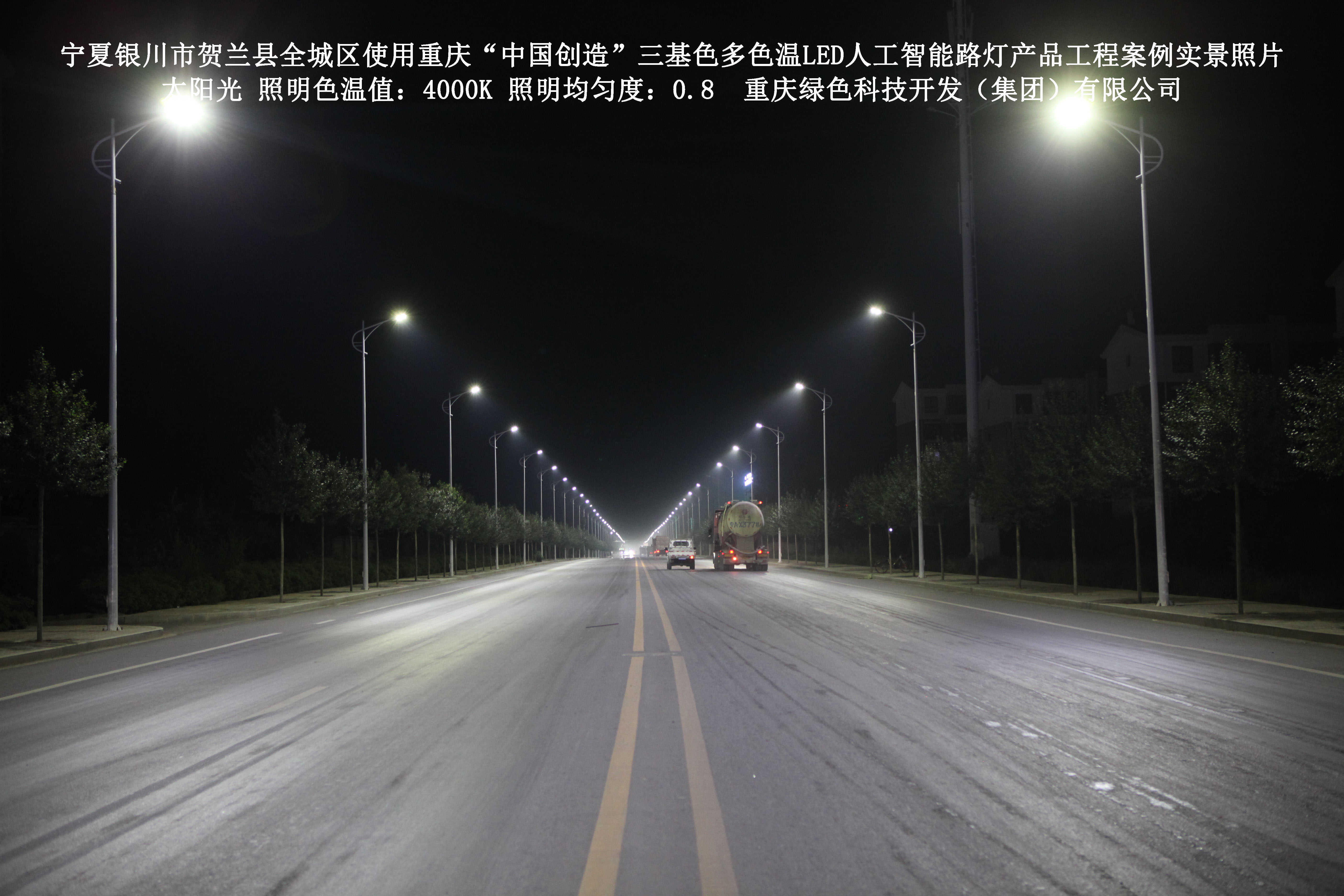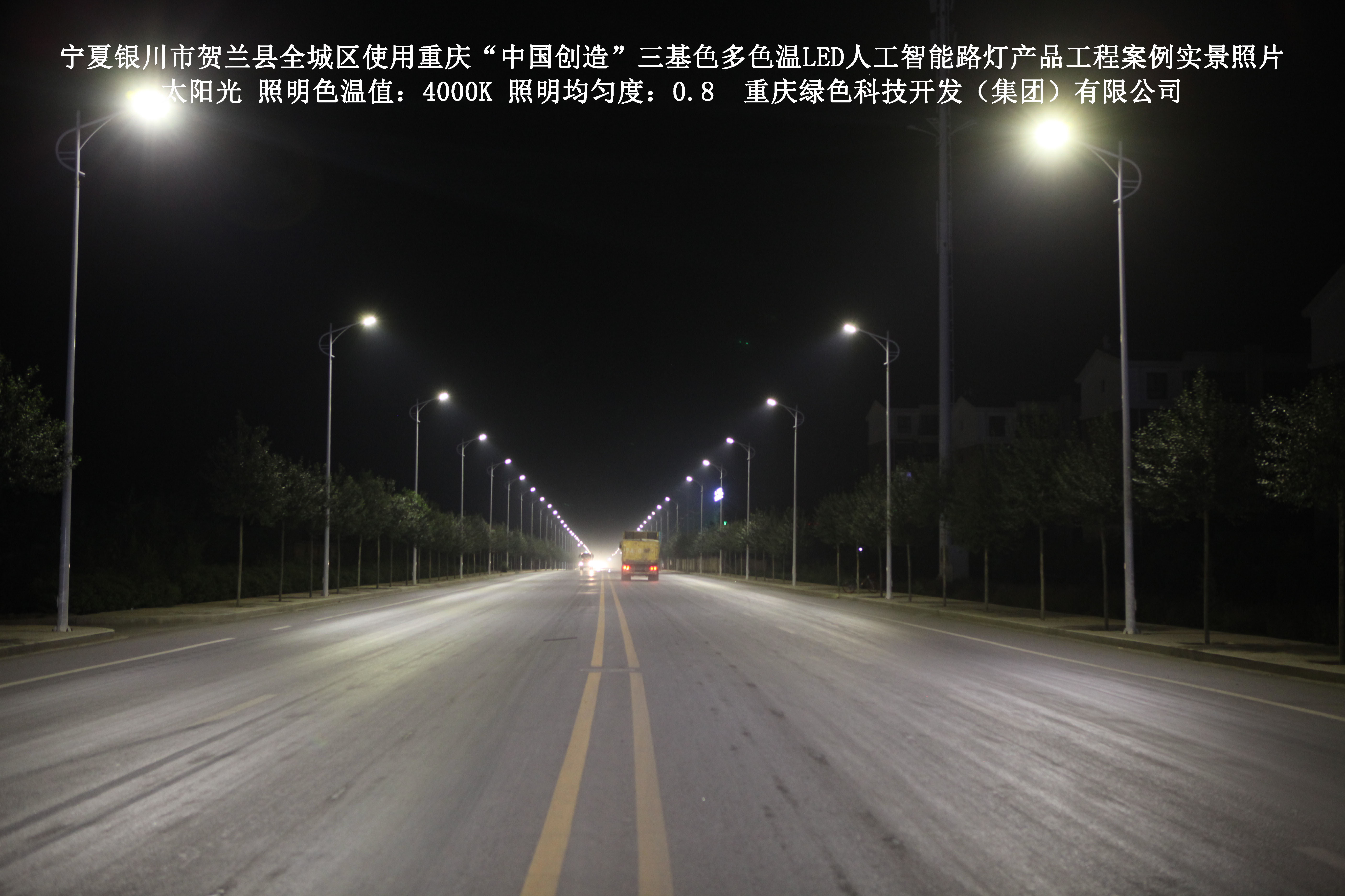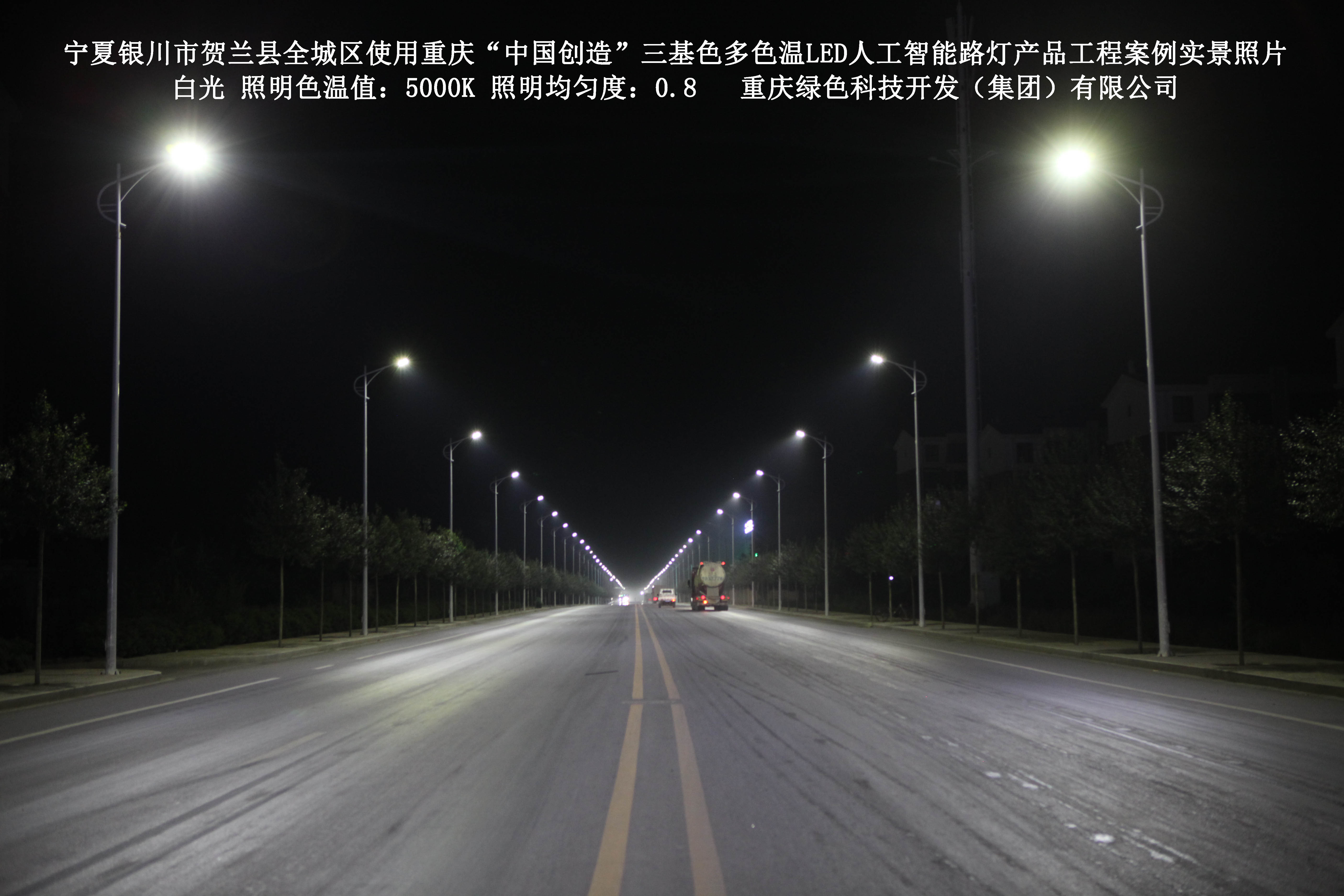 2017年12月,宁夏银川市贺兰县城市管理综合执法局,使用了我司研发制造的重庆“中国创造”三基色多色温LED人工智能路灯6348盏,对全城区实施了绿色照明科技节能改造工程,该工程已全面竣工。工程实施后,极大地提高了贺兰县全城区城市照明清晰度、灯光均匀度、舒适度。通过智能终端实现单灯感知、线缆防盗报警,与原高压钠灯相比,节能率60%以上,有效解决了关闭控制回路或间隔关灯方式造成的照明暗区,确保行人和车辆通行的安全,实现城市路灯照明系统的智能化管理,推进了智慧城市建设。