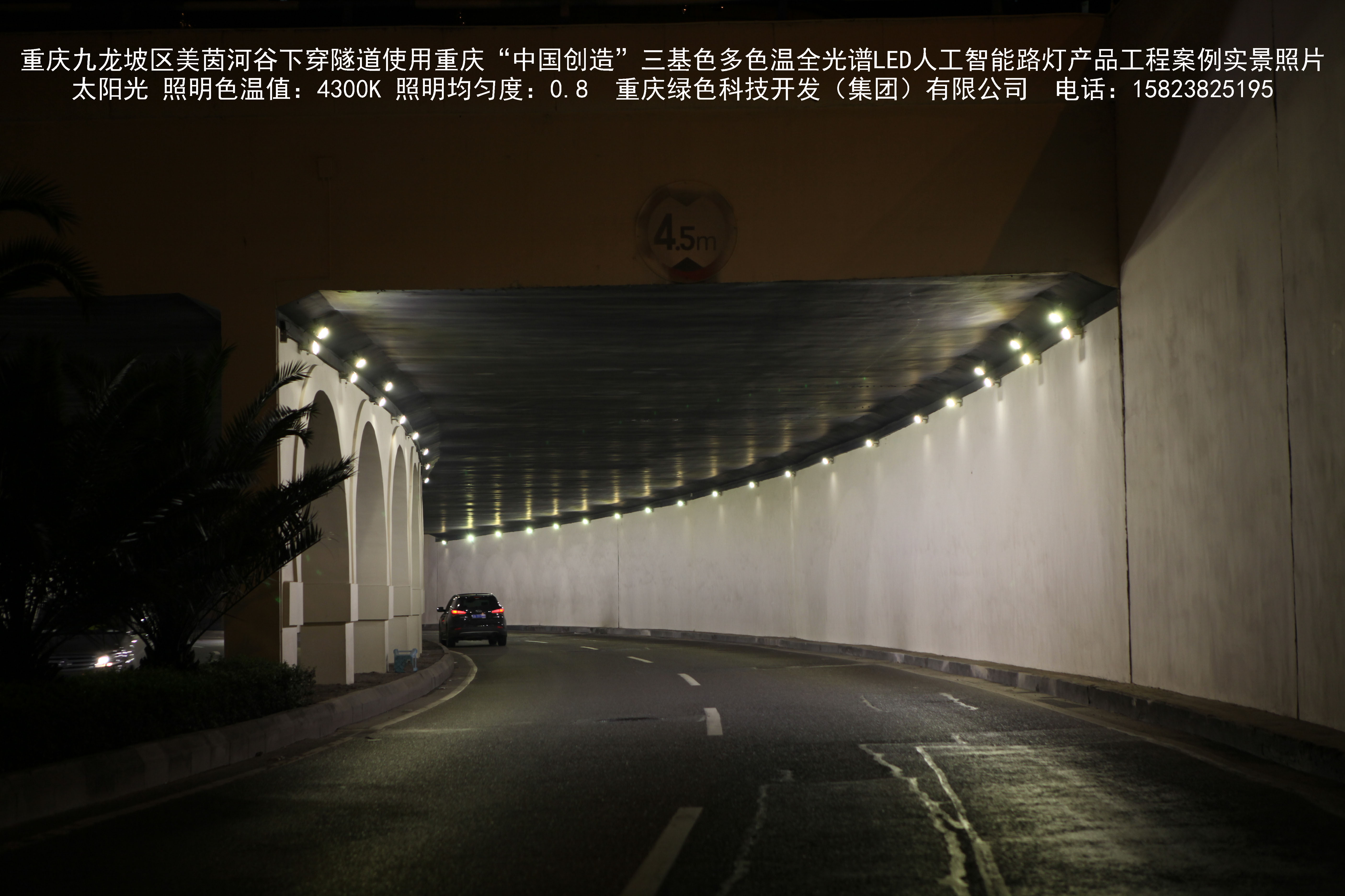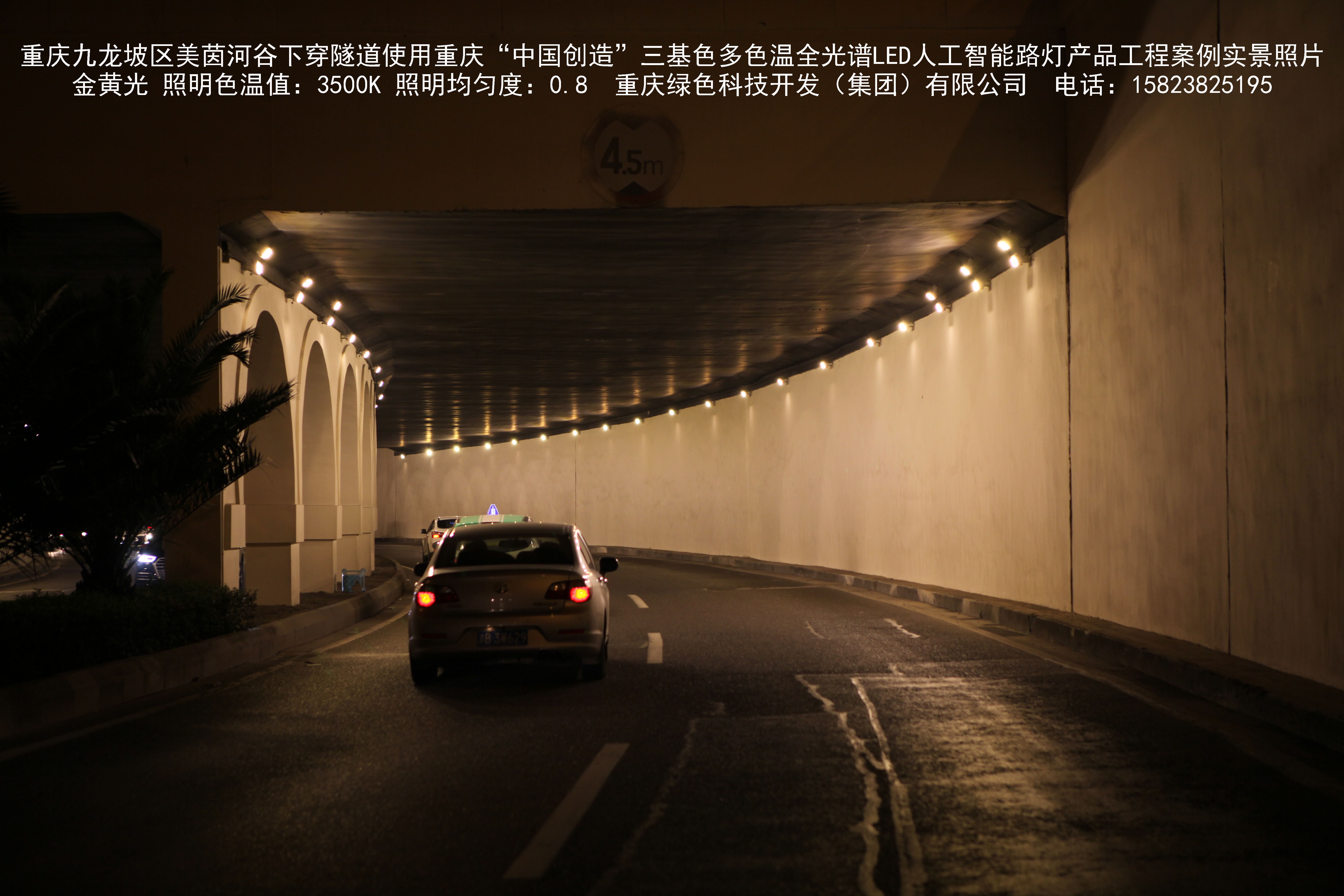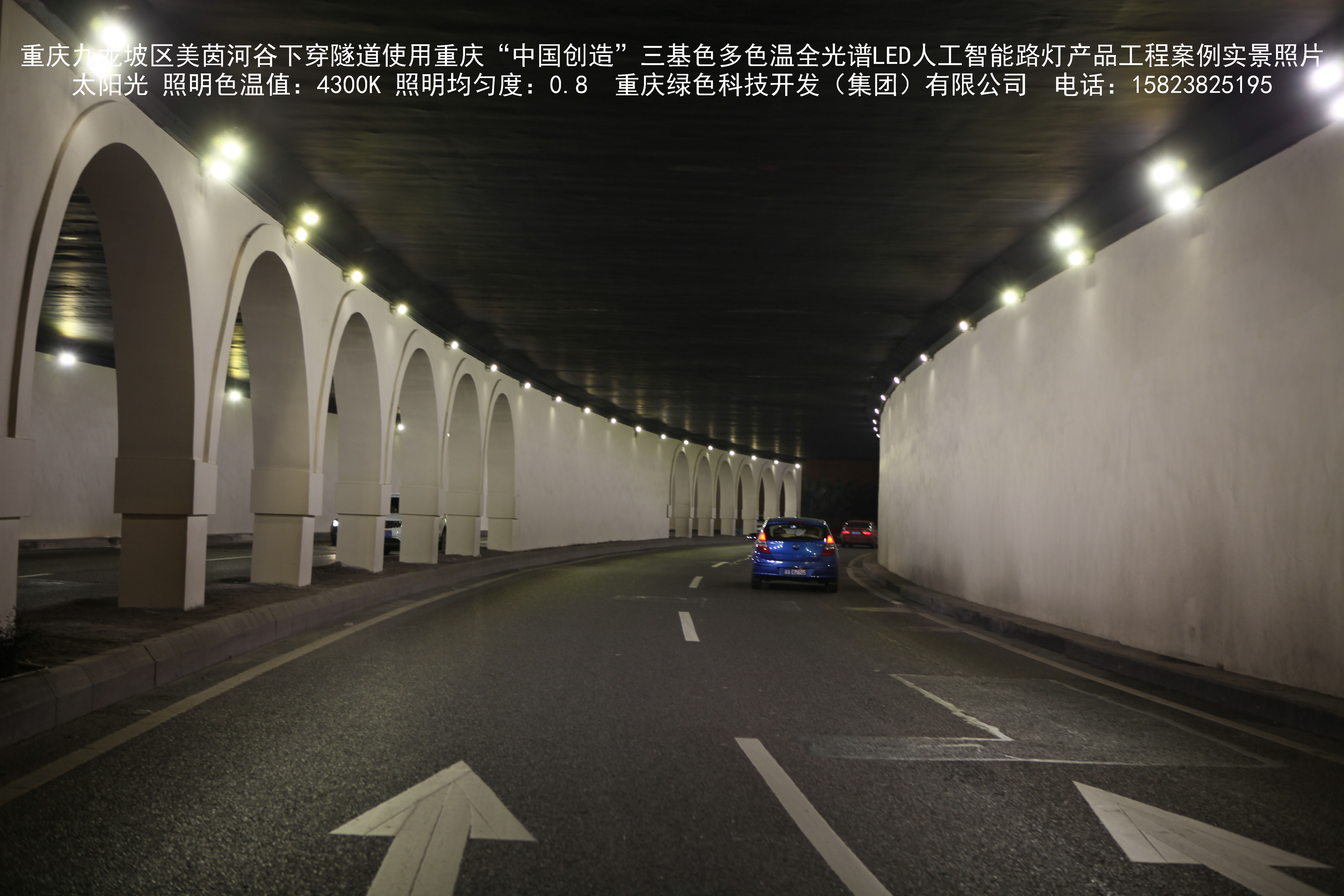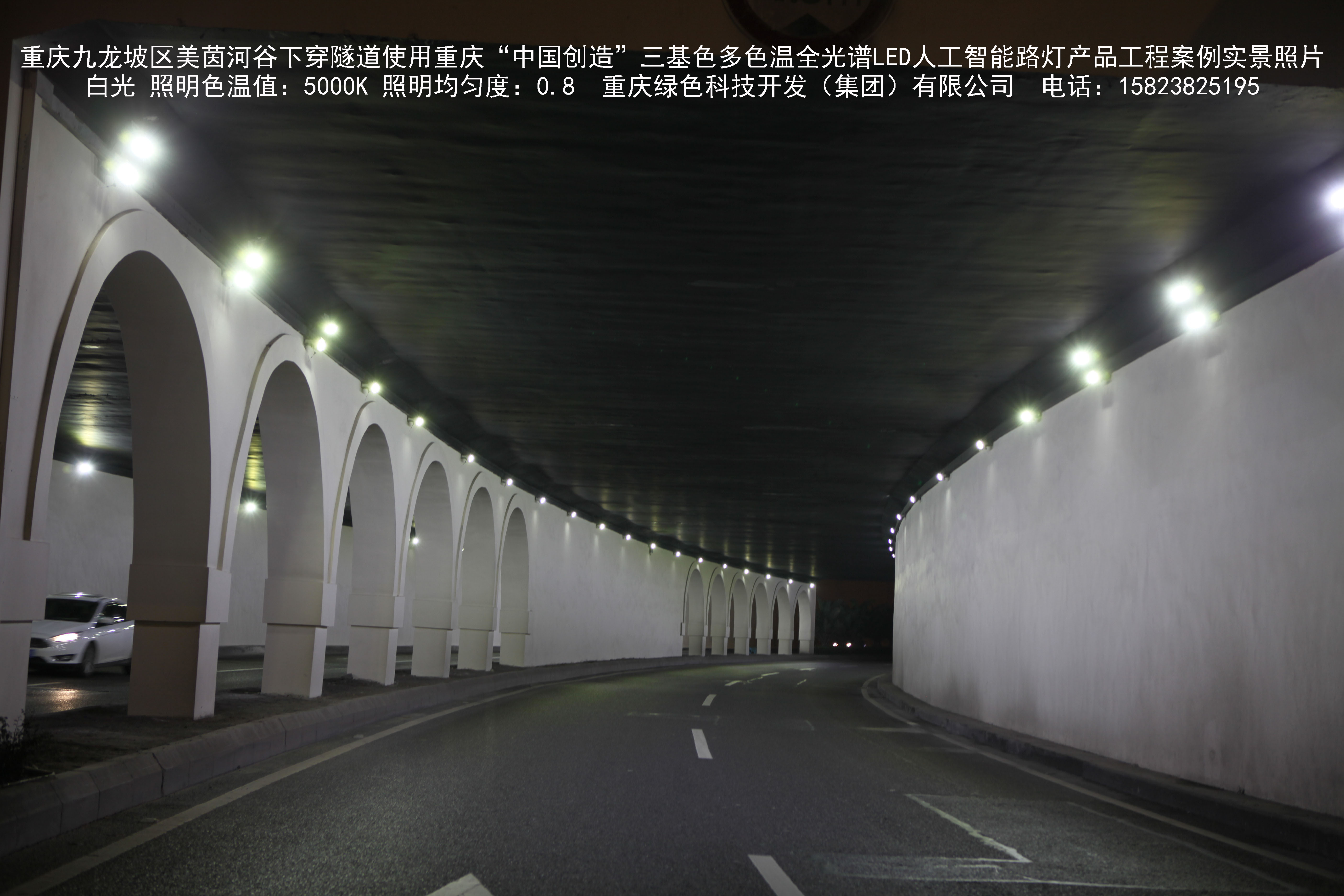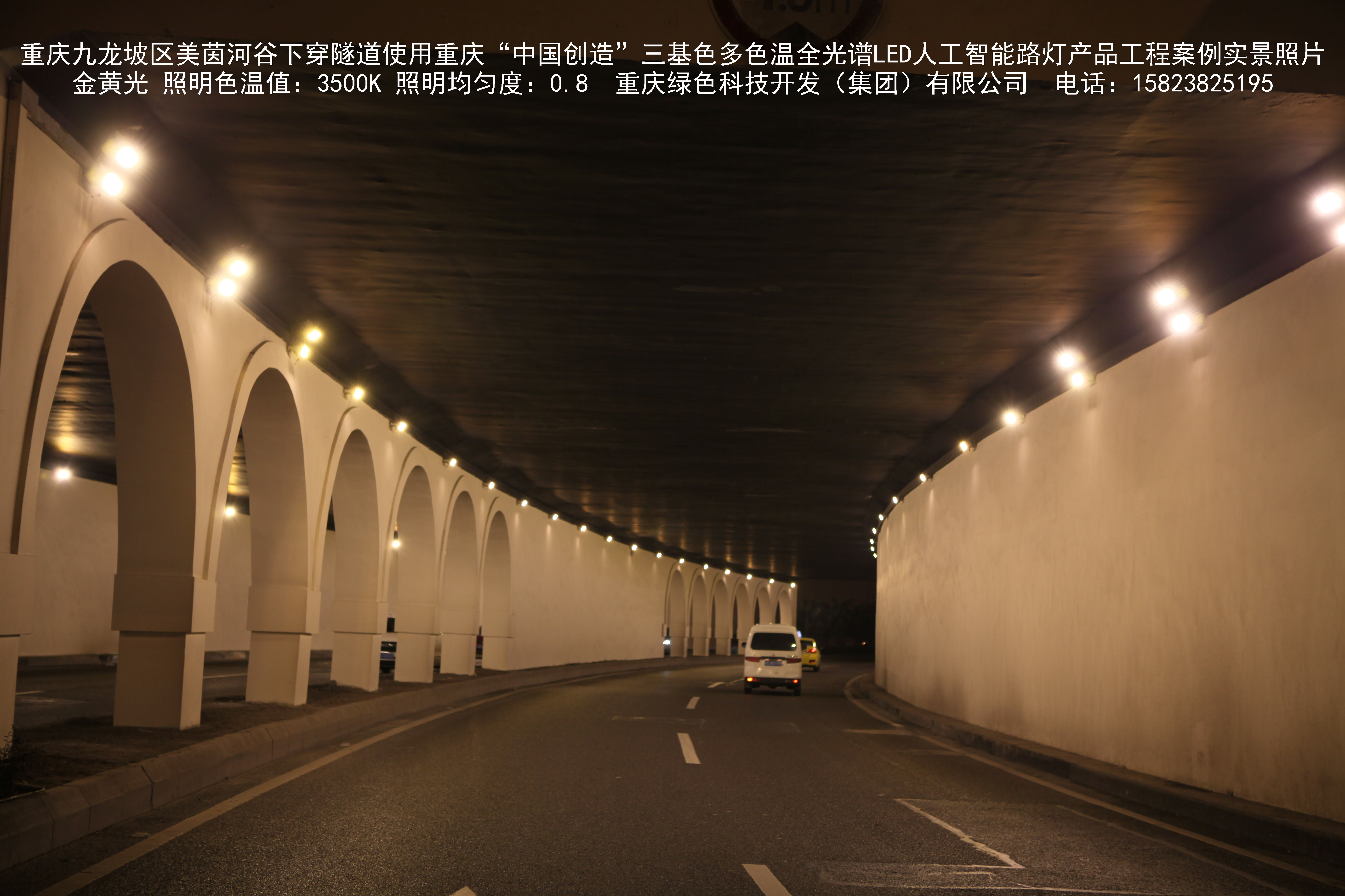 2018年9月,重庆市九龙坡区城市管理局使用我司自主研发制造的重庆“中国创造”三基色多色温全光谱LED人工智能隧道灯系列产品,实施了美茵河谷下穿隧道市政设施品质提升工程。该工程已全面竣工。工程实施后,极大地提高了城市照明清晰度、灯光均匀度、舒适度。通过智能终端实现单灯感知、线缆防盗报警,与原高压钠灯相比,节能率60%以上,有效解决了关闭控制回路或间隔关灯方式造成的照明暗区,确保行人和车辆通行的安全,实现城市路灯照明系统的智能化管理,推进了智慧城市建设。