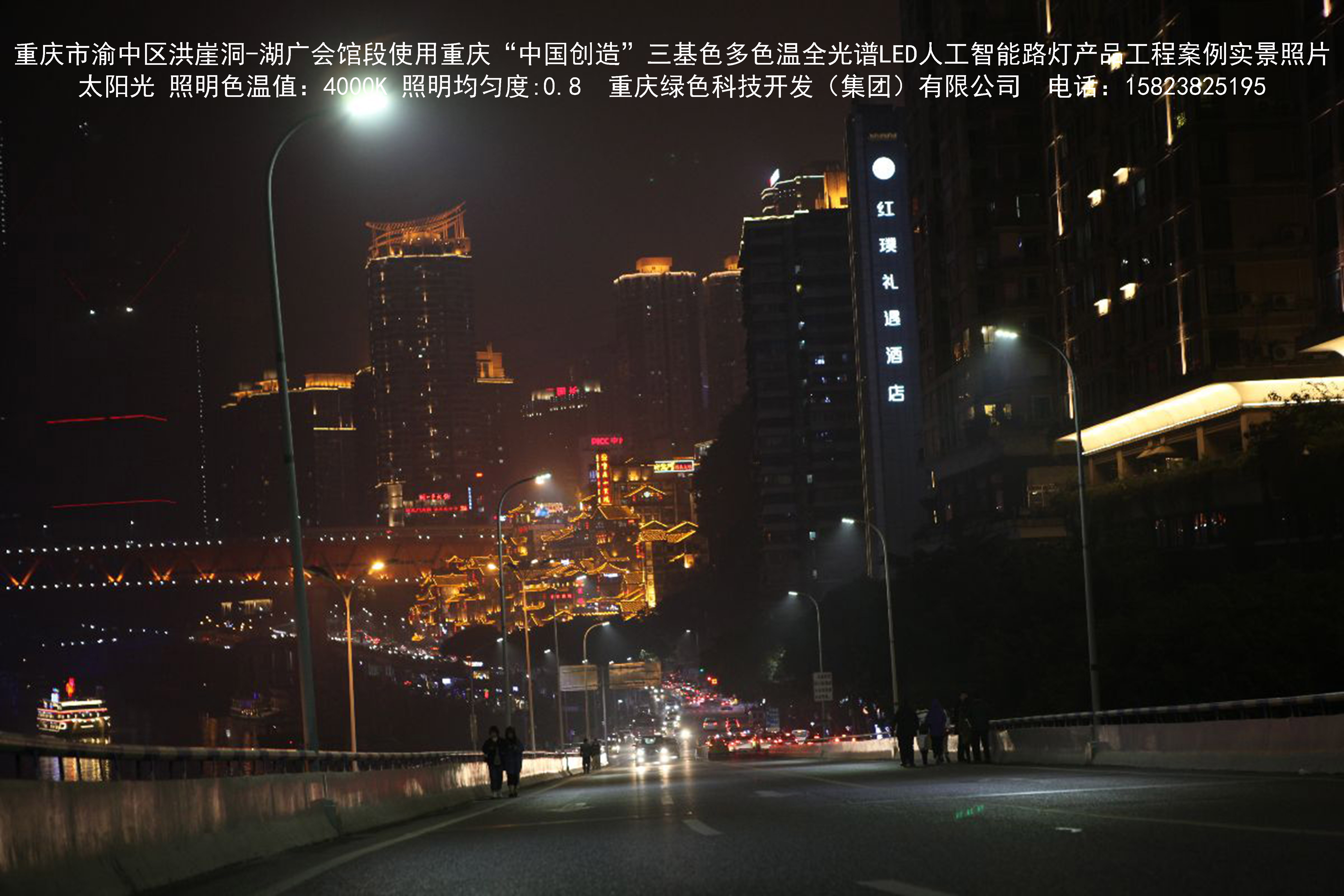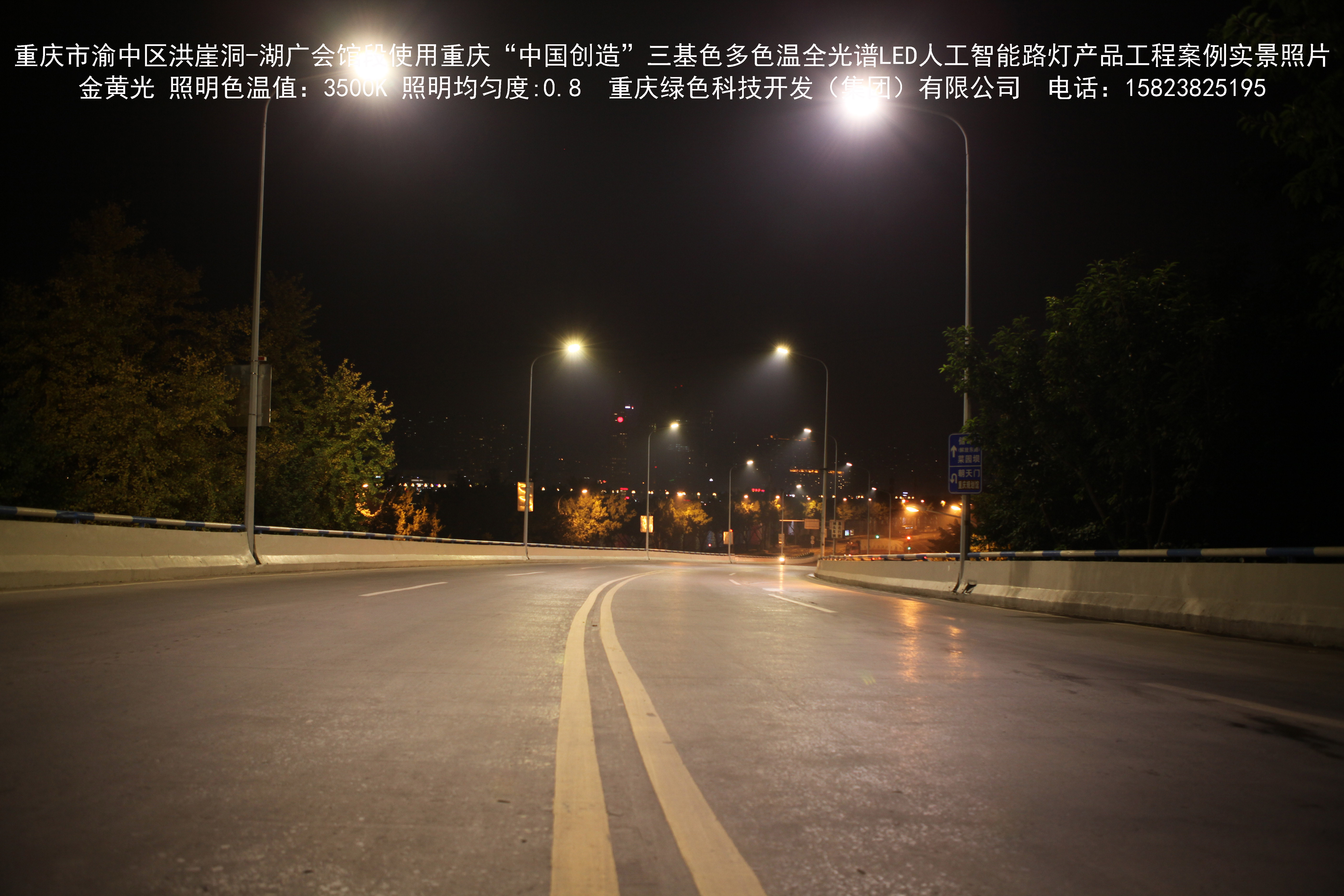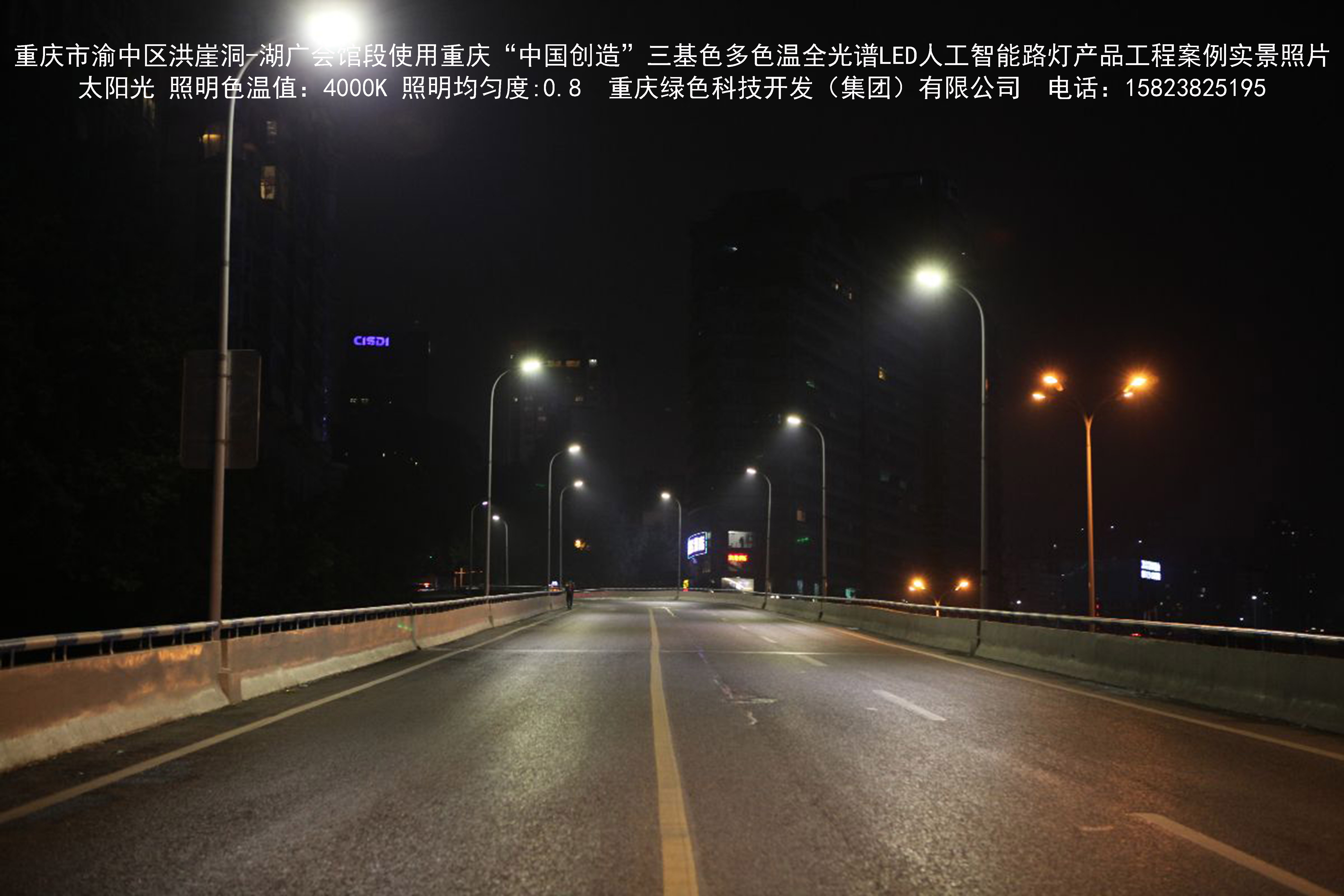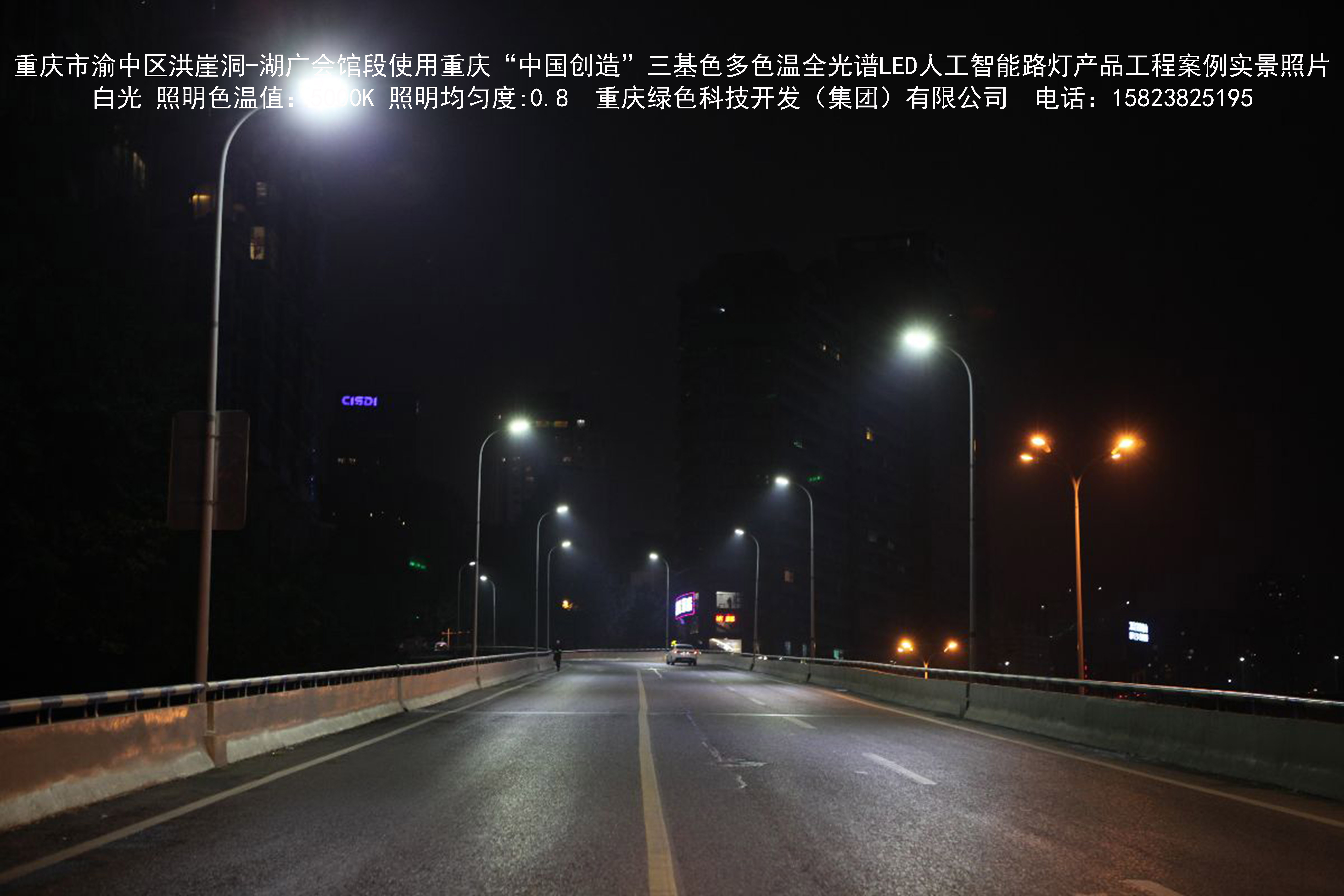 2018年12月,重庆市城市照明管理局使用我司自主研发制造的重庆“中国创造”三基色多色温全光谱LED人工智能路灯系列产品,实施了渝中区市政设施品质提升工程。该工程已全面竣工。工程实施后,极大地提高了城市照明清晰度、灯光均匀度、舒适度。通过智能终端实现单灯感知、线缆防盗报警,与原高压钠灯相比,节能率60%以上,有效解决了关闭控制回路或间隔关灯方式造成的照明暗区,确保行人和车辆通行的安全,实现城市路灯照明系统的智能化管理,推进了智慧城市建设。