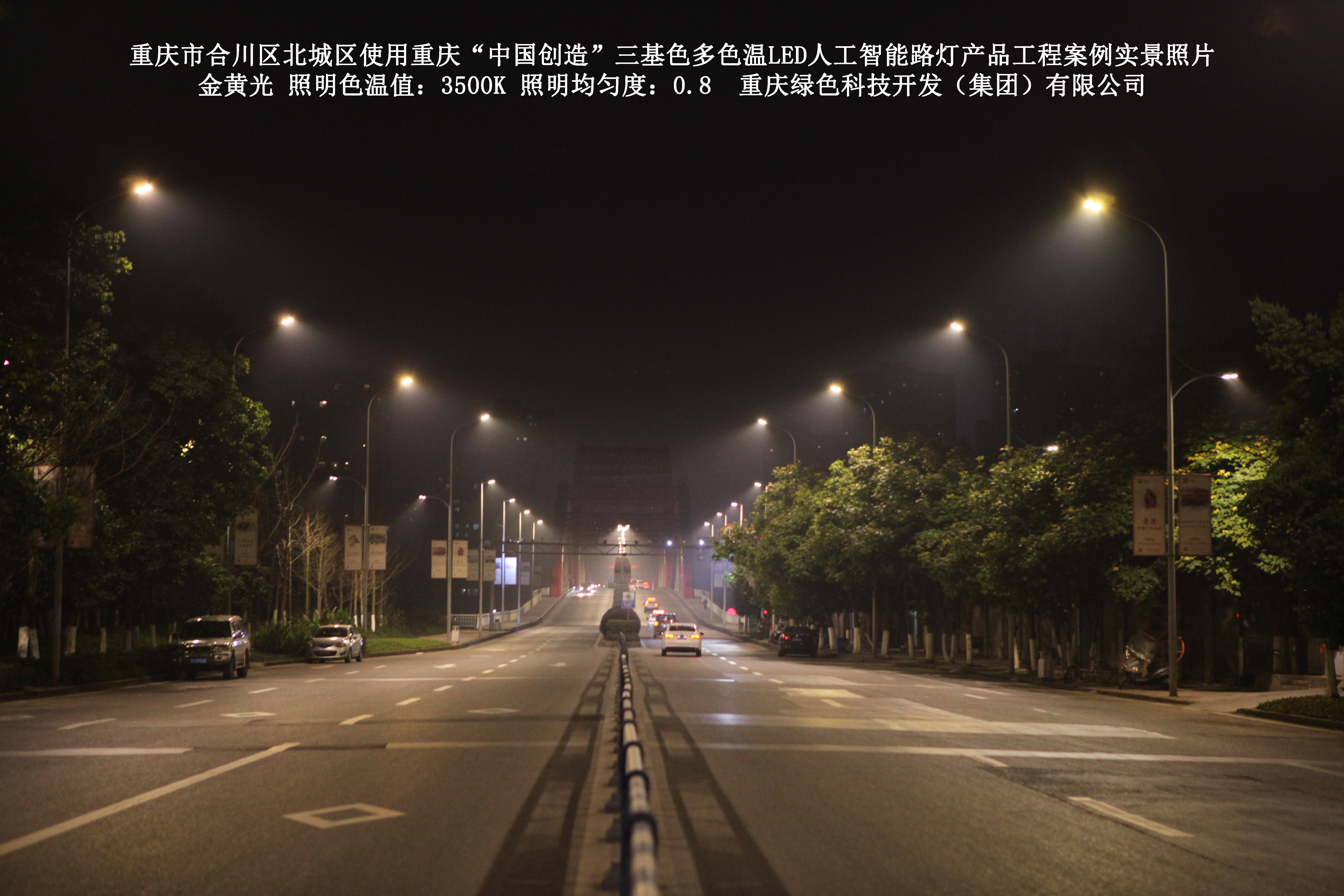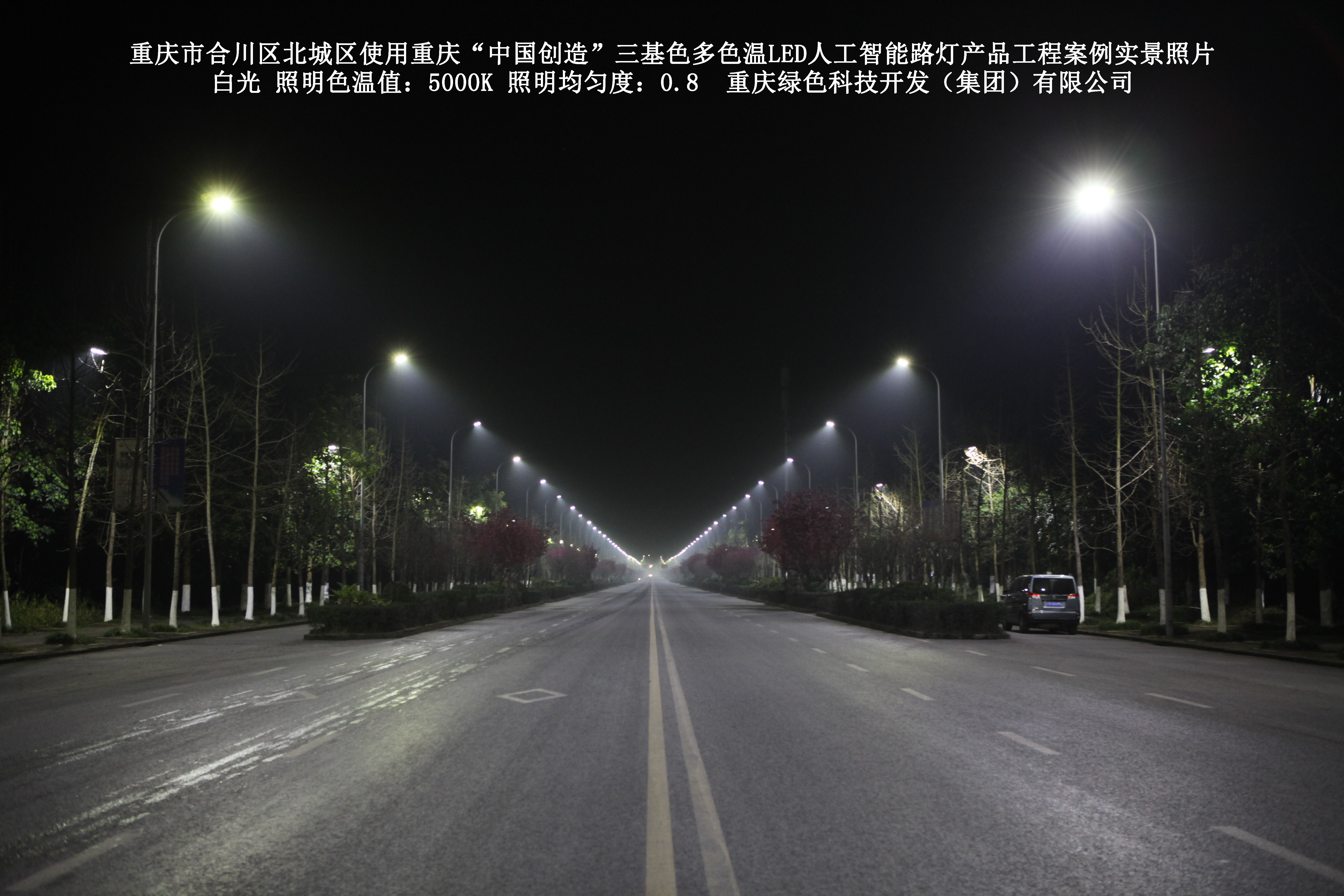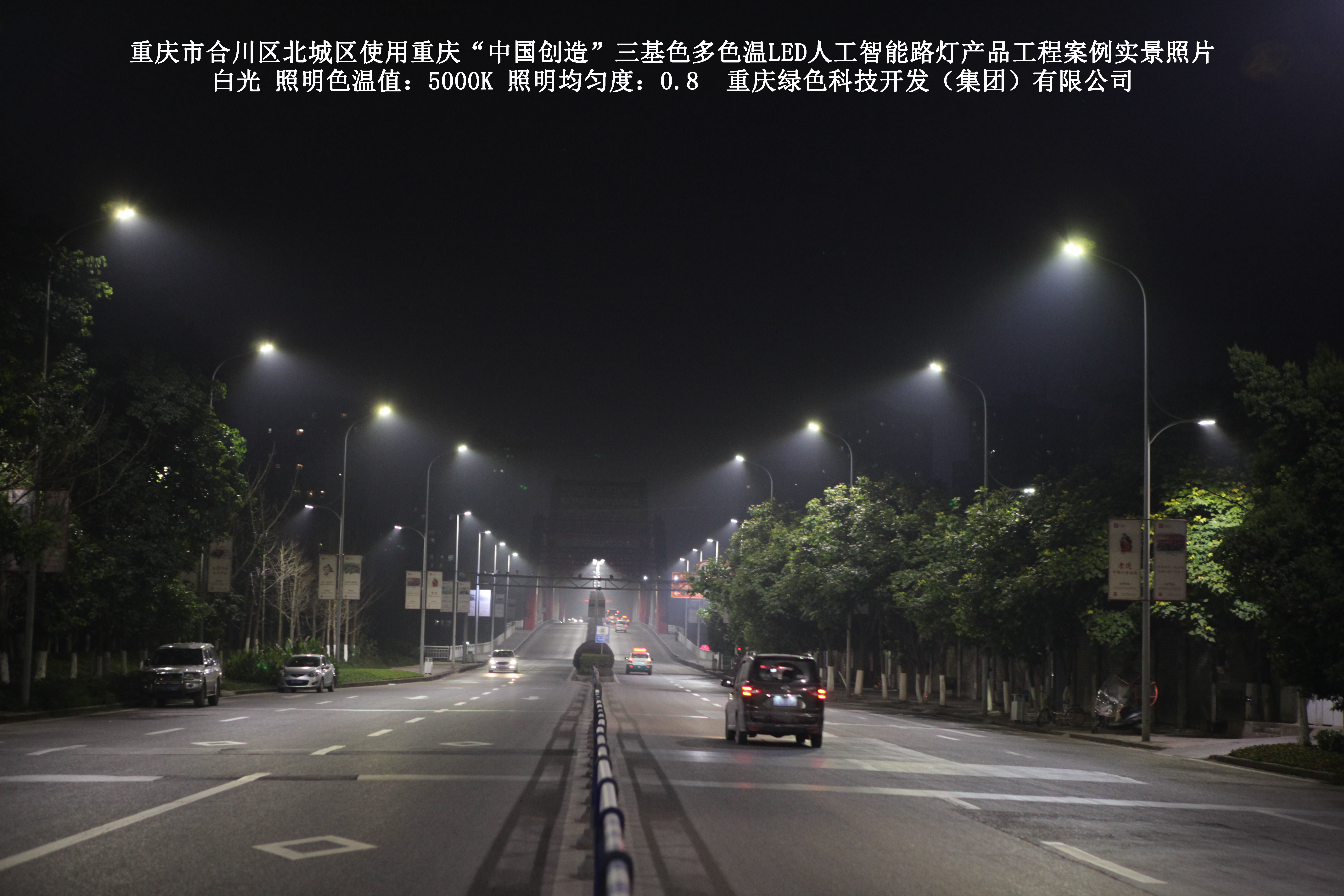 2019年1月,重庆市合川区城市管理局使用了我司研发制造的重庆“中国创造”三基色多色温LED人工智能路灯5144盏,对合川区北城区实施了绿色照明科技节能改造工程,该工程已全面竣工。工程实施后,极大地提高了合川区北城区城市照明清晰度、灯光均匀度、舒适度。通过智能终端实现单灯感知、线缆防盗报警,与原高压钠灯相比,节能率60%以上,有效解决了关闭控制回路或间隔关灯方式造成的照明暗区,确保行人和车辆通行的安全,实现城市路灯照明系统的智能化管理,推进了智慧城市建设。