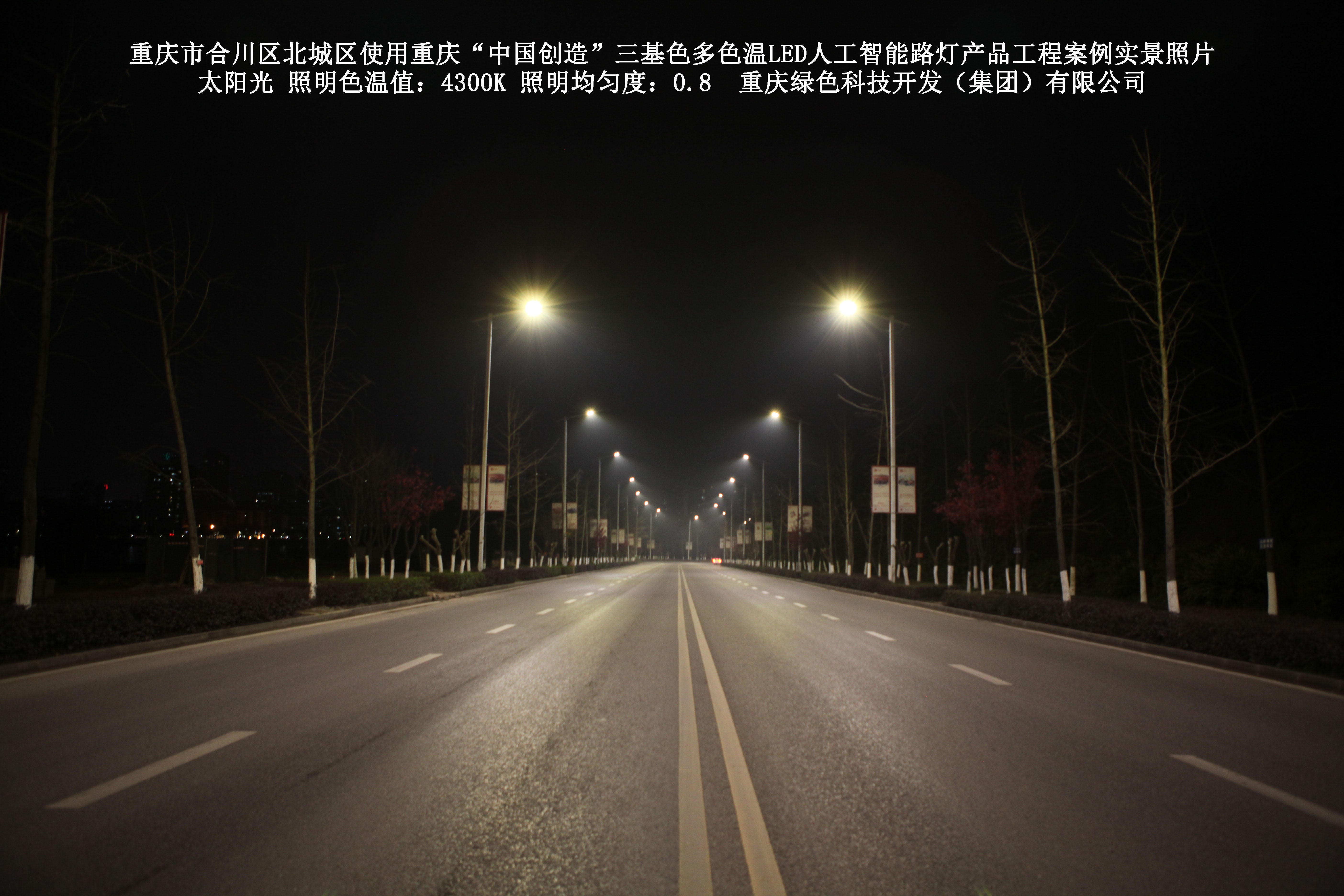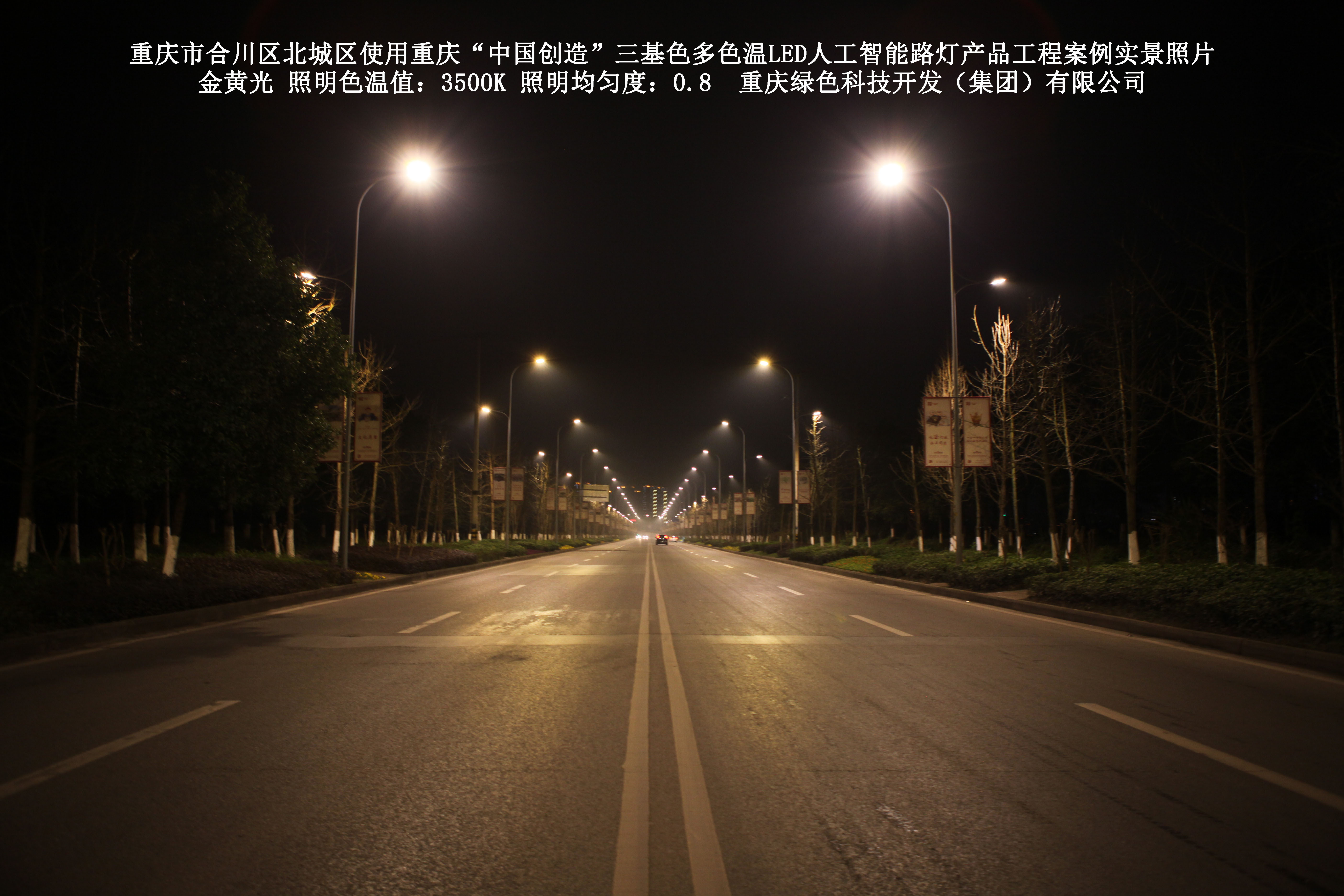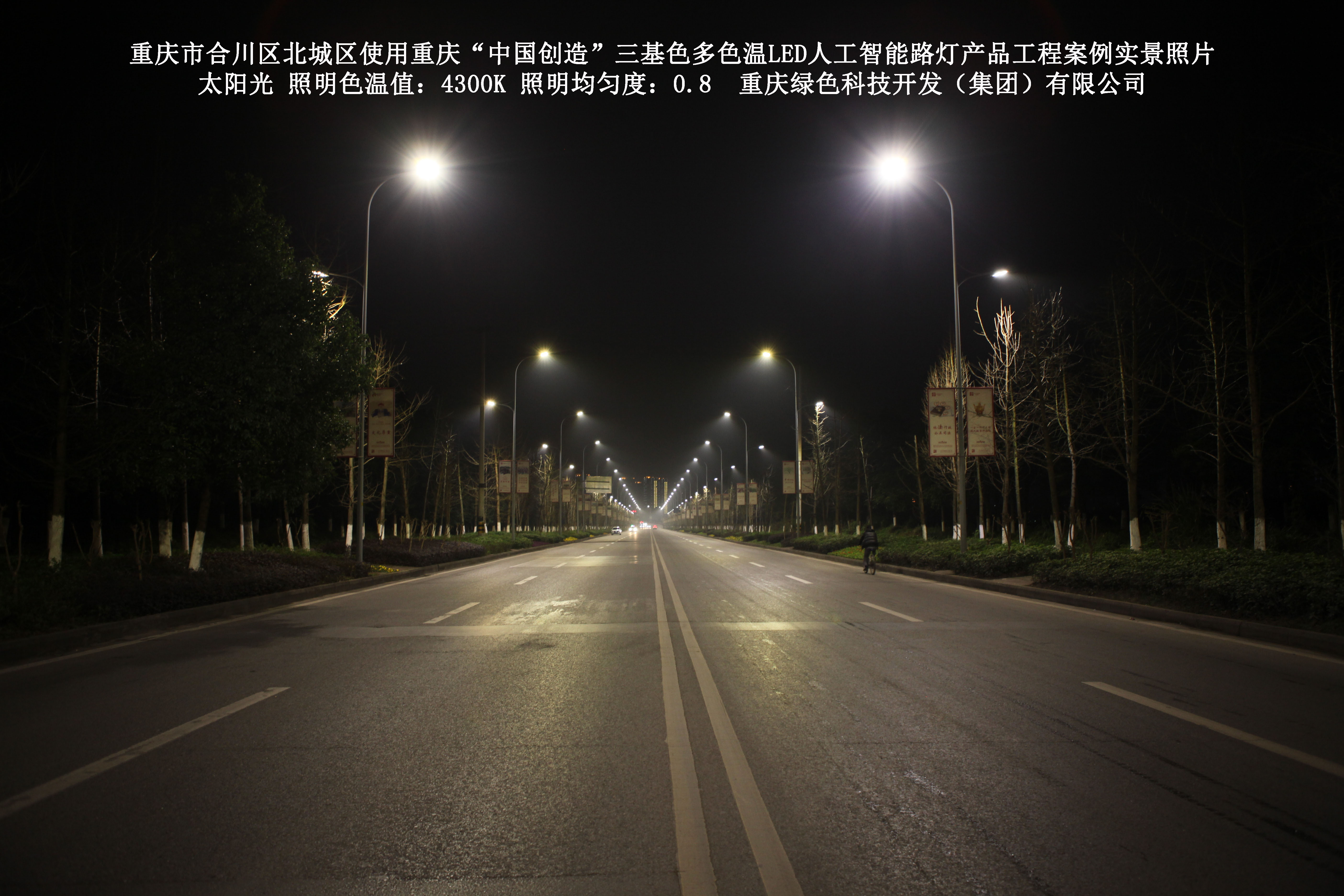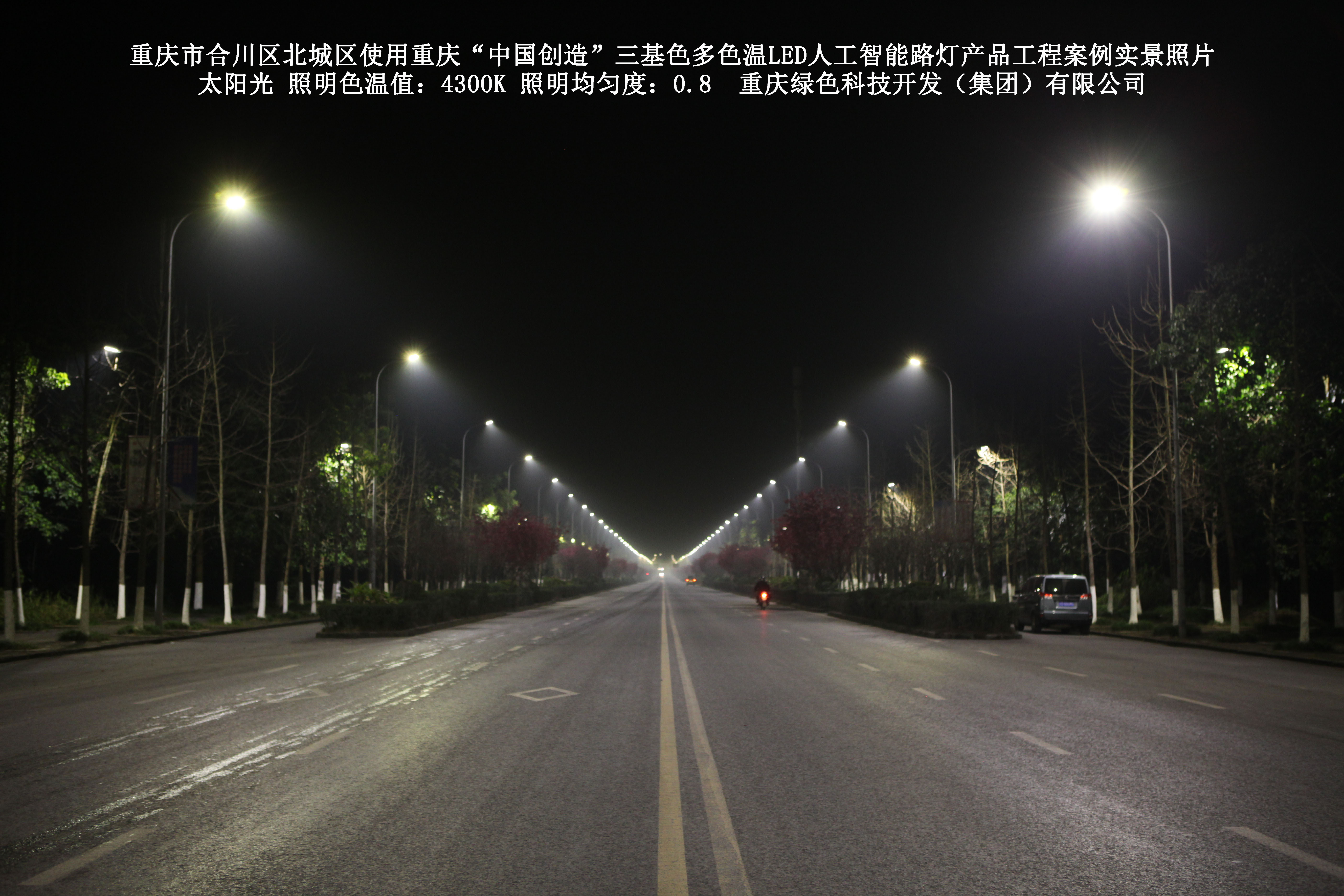 2019年1月,重庆市合川区城市管理局使用了我司研发制造的重庆“中国创造”三基色多色温LED人工智能路灯5144盏,对合川区北城区实施了绿色照明科技节能改造工程,该工程已全面竣工。工程实施后,极大地提高了合川区北城区城市照明清晰度、灯光均匀度、舒适度。通过智能终端实现单灯感知、线缆防盗报警,与原高压钠灯相比,节能率60%以上,有效解决了关闭控制回路或间隔关灯方式造成的照明暗区,确保行人和车辆通行的安全,实现城市路灯照明系统的智能化管理,推进了智慧城市建设。