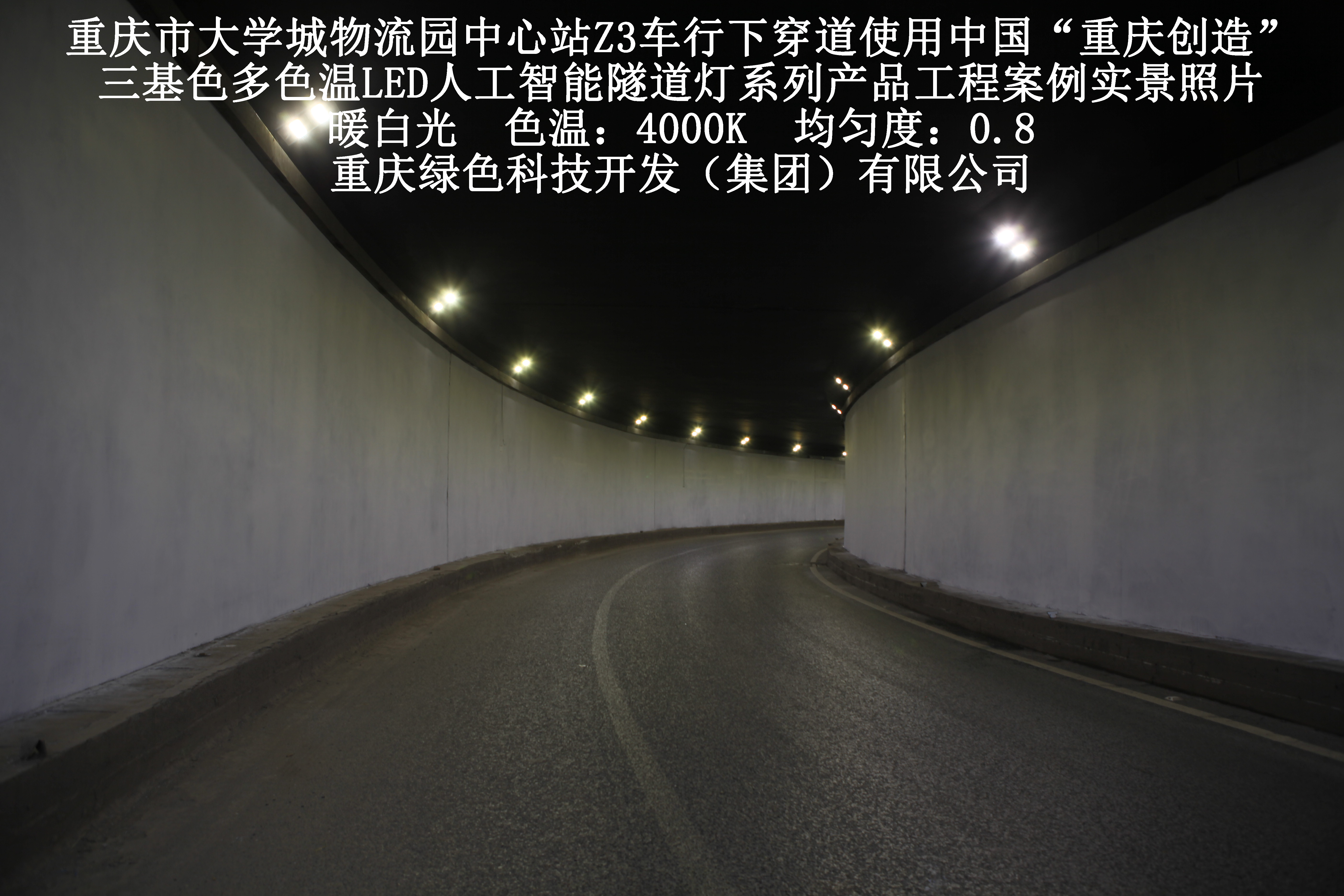 2019年3月,重庆市大学城物流园中心站Z3车行下穿道使用我司自主研发制造的,重庆“中国创造”三基色多色温LED人工智能隧道灯系列产品,实施了市政设施品质提升工程(工程案例实景照片附后)。此项目的实施,极大地提高了隧道内照明清晰度、灯光均匀度、舒适度及照明安全性,实现了隧道照明系统的智能化管理。