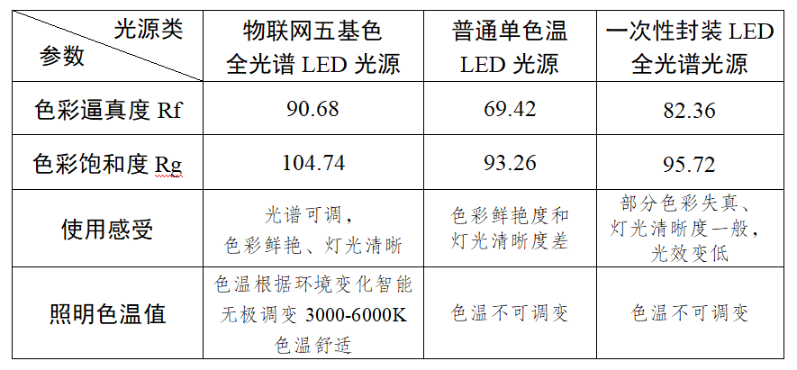 图2 物联网五基色全光谱多色温LED光源与普通单色温LED光源、一次性封装LED全光谱光源参数对比
